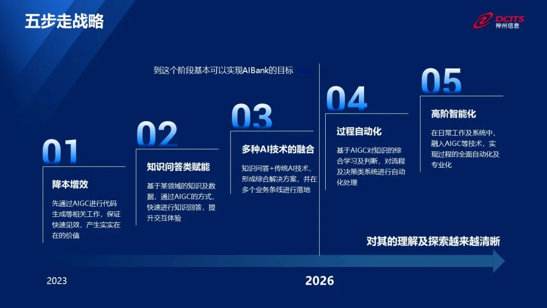 薛春雨指出,我国银行业大模型场景在多个方面都有涉及,主要选择还是以知识问答及代码生成为主,神州信息在这两方面也进行了相应的研发与探索。对于金融企业而言,直接使用基础大模型很难解决实际问题,在具体落地时需要聚焦在企业大模型及相关联的场景大模型方面。神州信息从场景大模型切入,逐步汇集成完整的企业大模型能力,希望通过从降本增效、知识问答赋能、多种AI技术融合到过程自动化、高阶智能化的“AI五步走”战略,最终建立起系统化的金融企业级大模型整体架构。